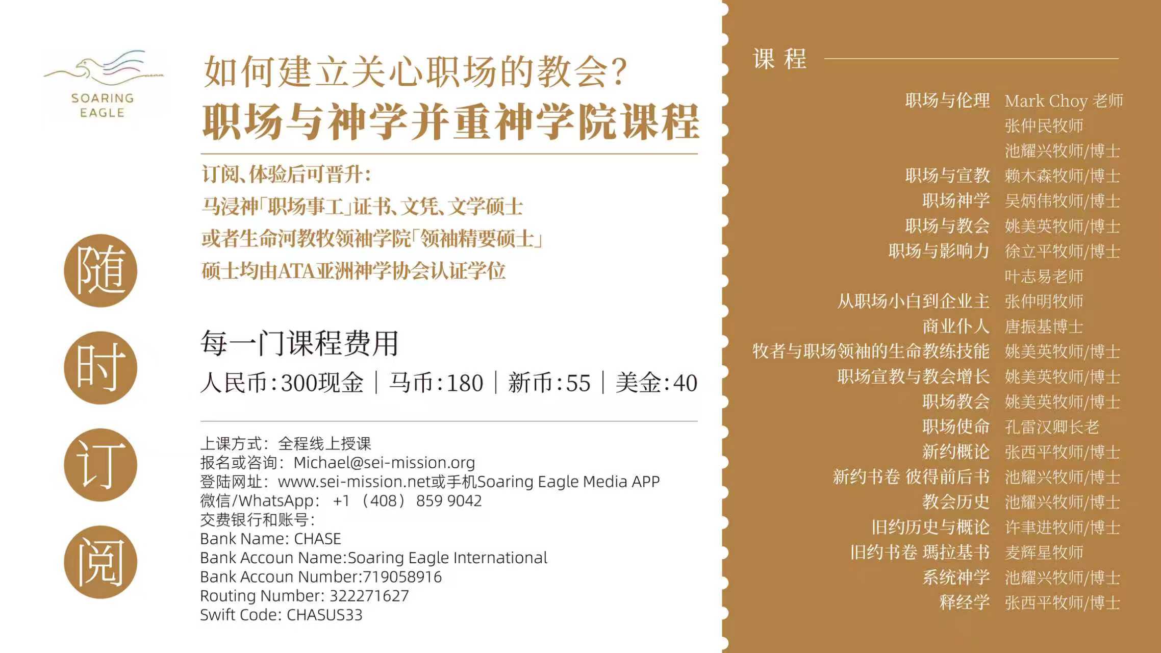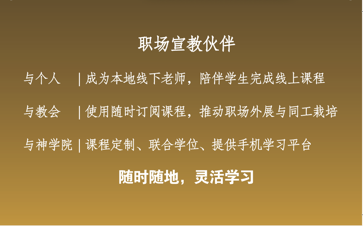 「国际飞鹰职场宣教机构」 助力您成为有影响力的职场人 我要报名 关于我们 我们关心您的职场!致力关注赋能您成为有影响力的职场人!我们期待我们的努力能助力您在职场上如鹰展翅上腾! 学到更多 欢迎你把你推动职场宣教的故事与我们分享 请联系 infor@sei-mission.org